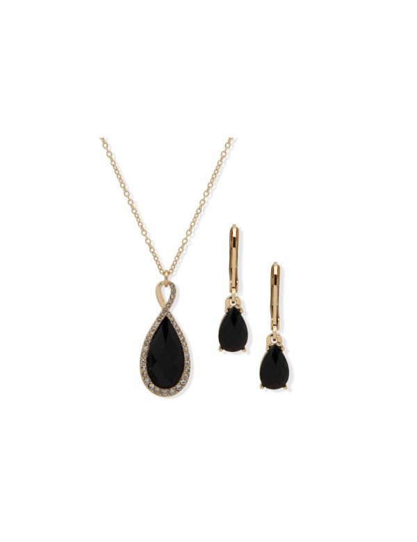 This gold-tone pendant and earring set features a vibrant stone complete with accent crystal detail.