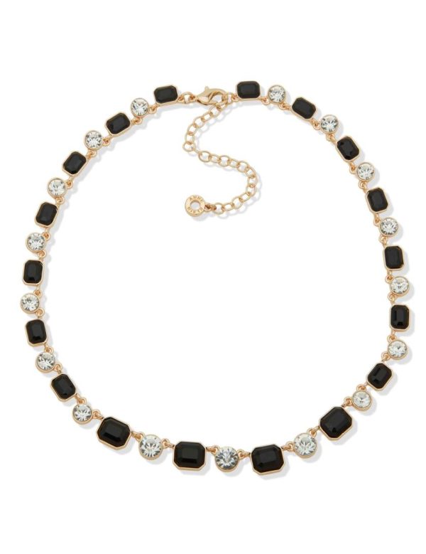 This alternating jet black and crystal bezel set stone necklace is the perfect statement piece to add to any look.