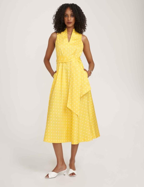 This bold and bright polka dot dress is sure to make a statement. Midi style with a waist tie and split neckline.