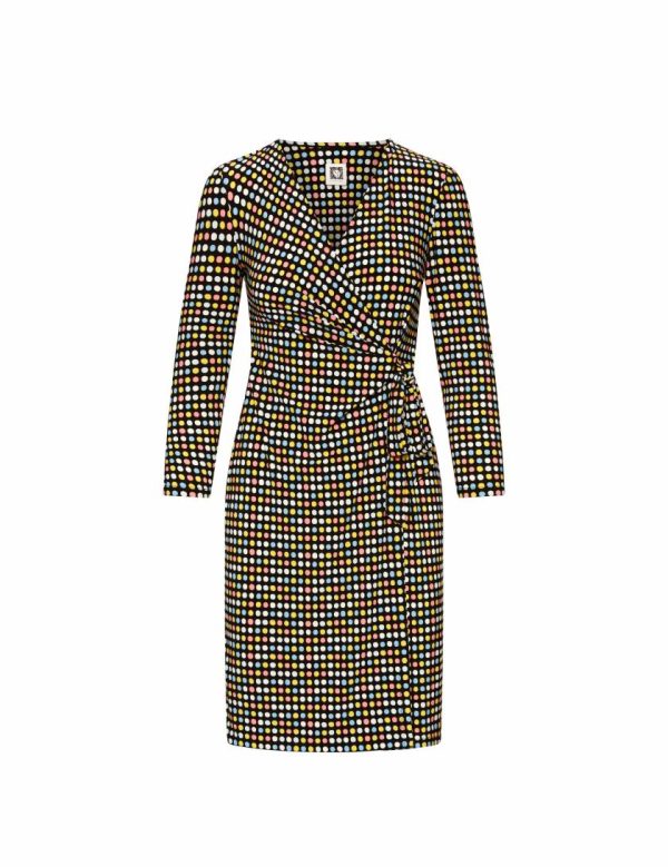 Our patterned wrap dress features a colorful dot pattern with a tie at the waist.