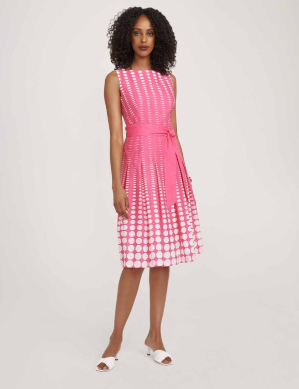 The dimensional dot pattern paired with the fit and flare silhouette creates an eye catching look. This sleeveless dress features a self tie belt and center back zip closure.