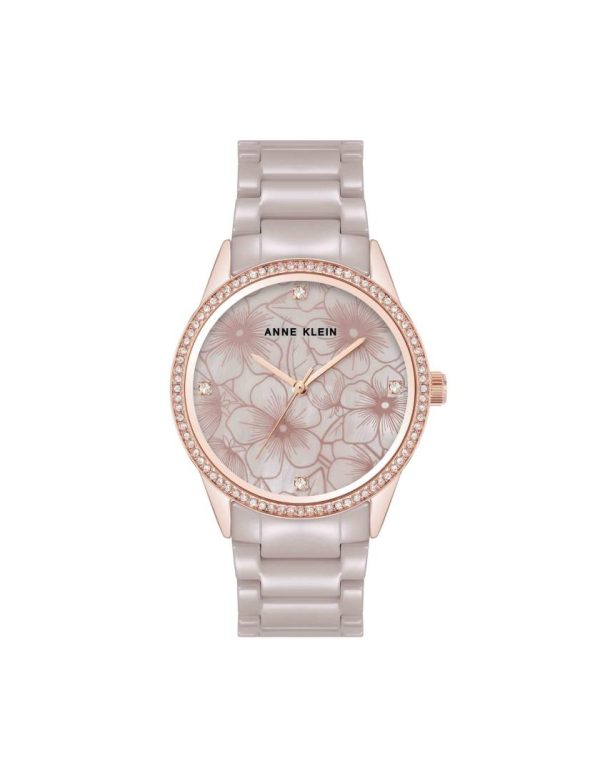 • Mineral crystal lens• Adjustable ceramic link bracelet with fold-over buckle closure• Genuine mother of pearl, flower pattern dial• Crystal accented bezel• Water resistant to 100 feet• Japanese quartz movement