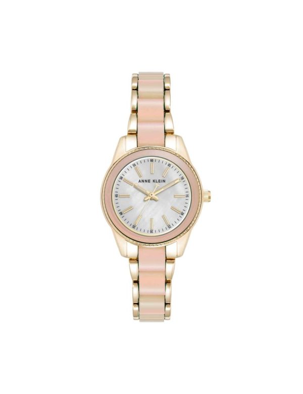 Featuring a mother of pearl dial and pearlescent acetate center links, this watch is both versatile and chic.