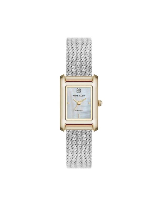 � Mineral crystal lens� Genuine mother of pearl dial � Genuine diamond accent at 12 o’clock� Adjustable stainless steel mesh band with sliding buckle closure� Japanese quartz movement� Splash resistant