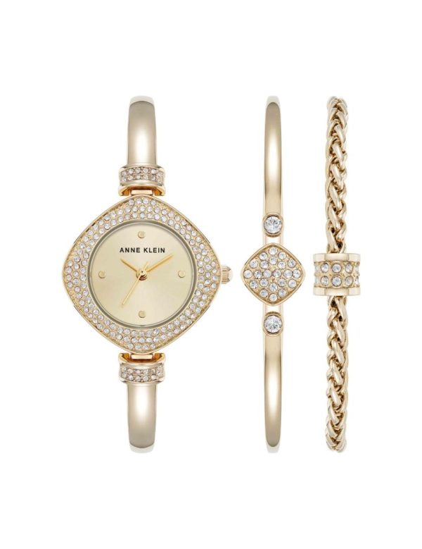 Elevate your ensemble with this crystal watch and bracelet box set. It features a striking crystal covered bezel and coordinating crystal accented bracelets, exuding timeless elegance and sophistication in every detail.